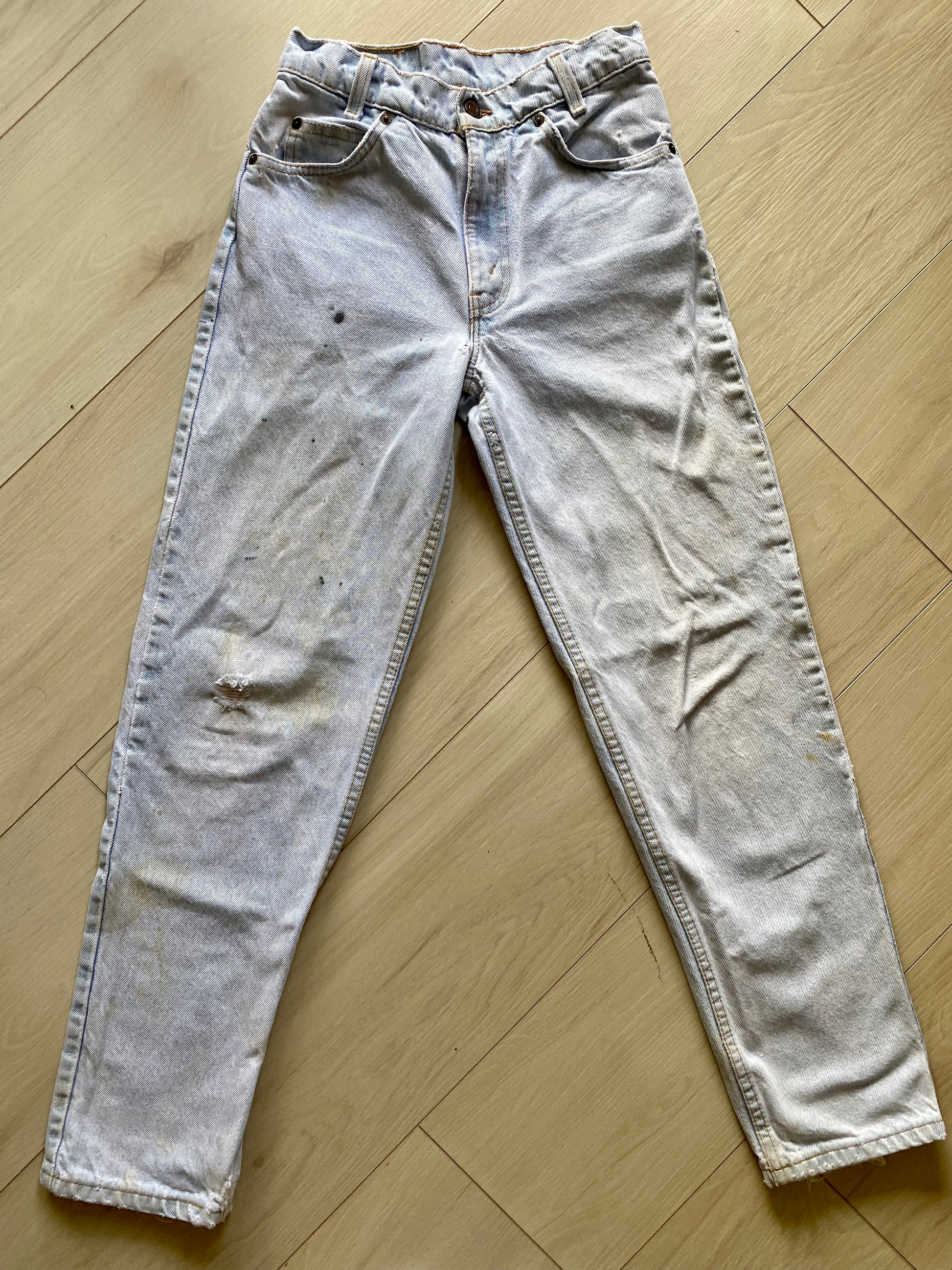 Super beat up Levi’s 550 student fit jeans. Tagged a size 26 these best fit a 23/24 due to rise and slim fit through the hip. Distressing and paint marks, sold as is